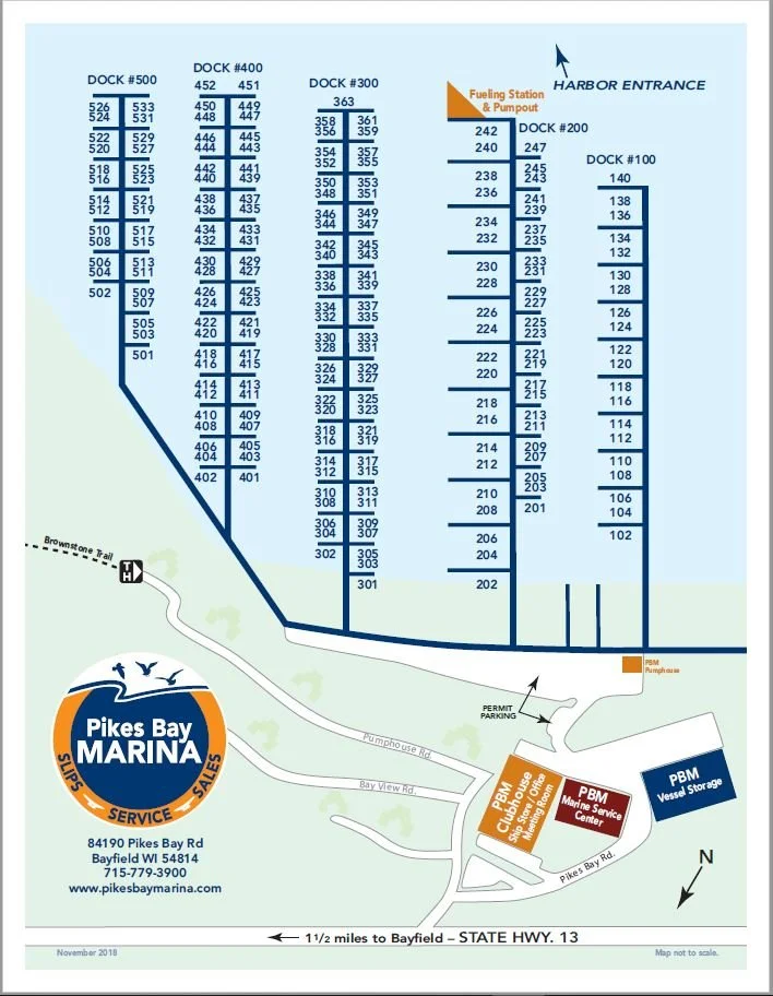 Whether it is your first time visiting us or your fiftieth – the Pikes Bay Harbor Map gives you a birds’-eye view of our dock layout. We are proud to be one of the safest harbors in the Apostle Islands with our beautiful black granite breakwater keeping wave action inside the harbor basin to a minimum. – A large contributor to being awarded 2018’s National Small Marina of the Year by Marina Dock Age.